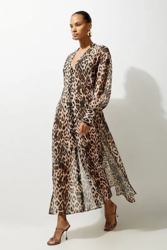Feel holiday ready in our maxi dress, made in viscose fabric, with a fierce leopard print, and a relaxed silhouette ideal for throwing over your bikini after a long day by the pool. The long sleeves block out the evening breeze, while the leg split design is certain to catch eyes. Style it with sandals for a look ideal for upcoming hot days and holidays.Printed Viscose Maxi Beach DressHigh Quality Viscose FabricFlattering, Relaxed SilhouetteBold Leopard Print DesignStatement Maxi LengthPlunging V NecklineDramatic Thigh High Leg SplitLong SleevesDetails & Care100% cotton. Gentle machine wash at 30 with similar colours. Model wears size s. model height 5″9. Centre back length of a size 10: 110cm