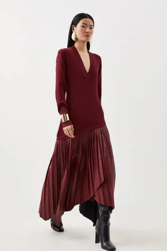 Geometric shapes are made with this midi dress. Sumptuous knit sculpts the bodice from a V-neckline to long sleeves, while an asymmetric cut is made at the hips with a pleated skirt that falls to a waterfall hemline. Pair with leather boots for a unique style statement.V-necklineLong sleevesSheer knit topPleated midi skirtDetails & Care59% Viscose. 41% Polyamide. Hand wash in cool water. Model wears UK Small. Small centre back length approx 125cm.