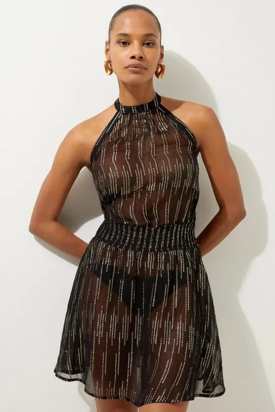 Crafted with striking metallic motifs, this piece goes seamlessly from day to night, a true summer staple. It features a strappy, halter neckline and shimmering metallic detailing adornes the entire garment. Complete with a full skirt at a playful, mini length, this style flows freely, making an easy and comfortable summer outfit to keep reaching for.Racer Neck Metallic Thread Woven Beach Mini DressUnique, Sheer Fabric Shimmering, Metallic Stitch Detailing Relaxed, Flowing FitSophisticated Strappy Halter Neckline Low Back Design Tie Back FasteningDetails & Care94% Viscose Rayon 6% Metallised fibre. Hand wash separately in cool water using non-biological liquid detergent. Model wears a S. Centre back length of a S: 90cm