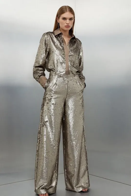 Party Outfits35% off*Last Chance to BuyWide Leg PantsSequins & EmbellishmentCLOTHINGCYBER DEALSSALEThe ultimate party piece, these sequinned pants are cut in a relaxed wide leg style to exude after-dark decadence. Make an instant statement and style this standout piece with the matching shirt and barely-there heels.PantsSequinsHigh waistedWide legDetails & CareMain/Lining: 100% Polyester. Gentle machine wash at 30 with similar colours. Model Height 5”10 – Model wears a UK 8/US Size 6.
