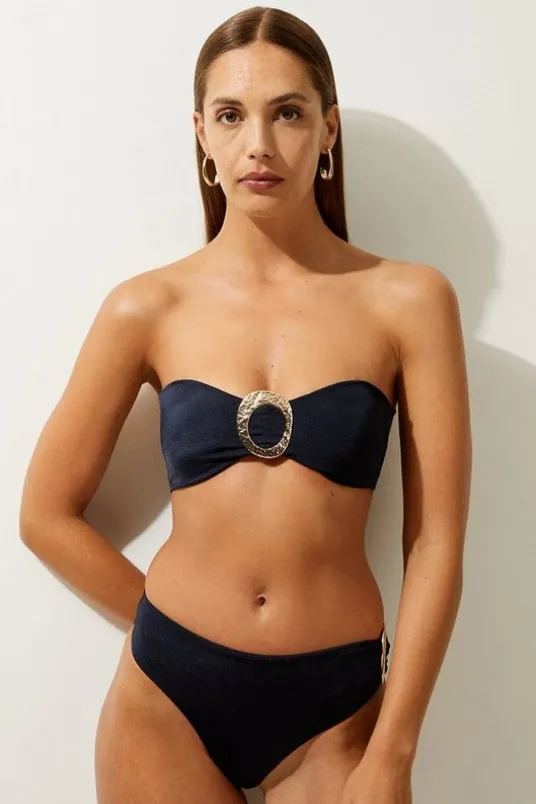 Simple poolside glamour comes guaranteed with this classic bikini top with a bandeau cut and front ring detailing. Pair this piece with the matching bikini bottom for an elegant beach moment.Bikini topBandeau styleRing detailDetails & Care82% Polyamide 18% Polyester. Wash at 30. Model wears UK Small.