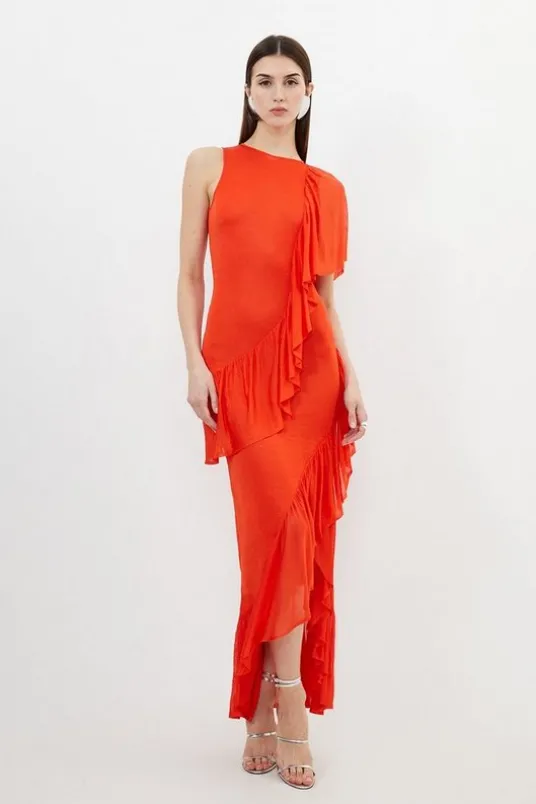 Slinky Knit Woven Mix Ruffle Midaxi Dress