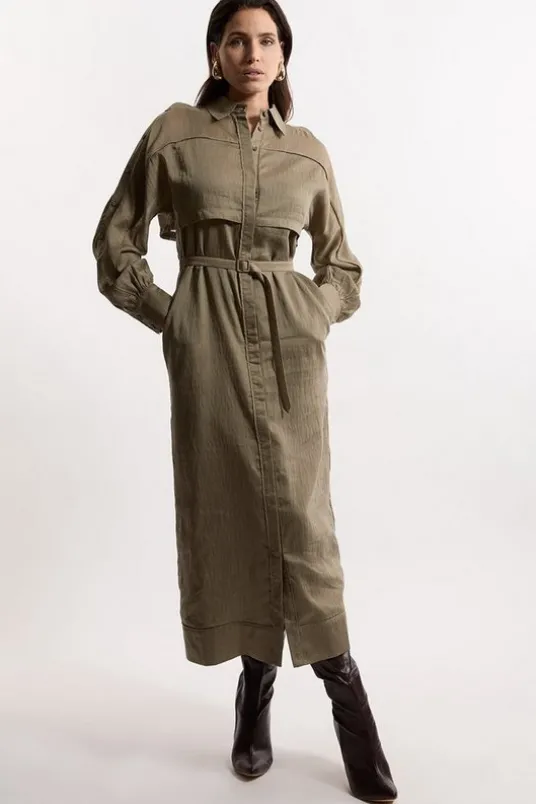 Slub Organdie Woven Utility Midi Dress With Button Sleeve Detail