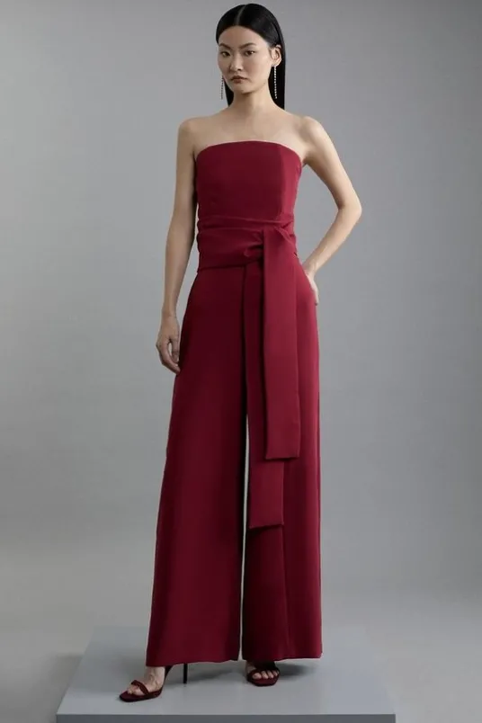 Experience elegance with our bandeau jumpsuit, designed to elevate your style for any special occasion. Featuring wide legs and a tie waist detail, this jumpsuit beautifully shapes your figure and ensures you’ll stand out with confidence. Pair it with sleek strappy heels for a polished look, perfect for weddings, date nights, or parties.Soft Tailored Colourblock Tailored Bandeau JumpsuitFlattering Tailored BodiceWide-Leg TrousersTie Waist DetailBandeau NecklineSide Zip FasteningDetails & Caremain: 100% polyester Lining: Polyester. Model wears UK10/US6. Model height 5″9. Leg length approx: 82cm
