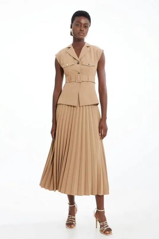 Soft Tailored Crepe Belted Pleated Midi Dress