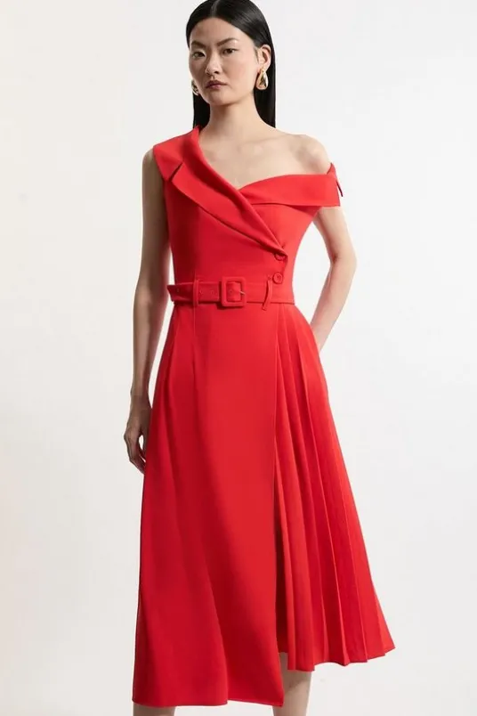 Get occasion ready in our midi dress, made in comfortable crepe fabric, with a fitted silhouette in the bodice, which boasts an asymmetric neckline and one shoulder design, and a flared skirt with pleated texturing. Style it simply with strappy sandals or heels for a look that will take you from wedding guest days to formal events.Soft Tailored Crepe One Shoulder Belted Pleated Midi DressHigh Quality Crepe FabricFlattering Fitted Bodice Unique Vest Style Bodice Statement Off Shoulder DesignBelted WaistlineFlowing, Pleated SkirtButton Front FasteningDetails & CareMain 72% polyester, 28% recycled polyester, lining 100% polyester. Dry clean only. Model wears UK10/US6. Model height 5″9. Item length 125cm