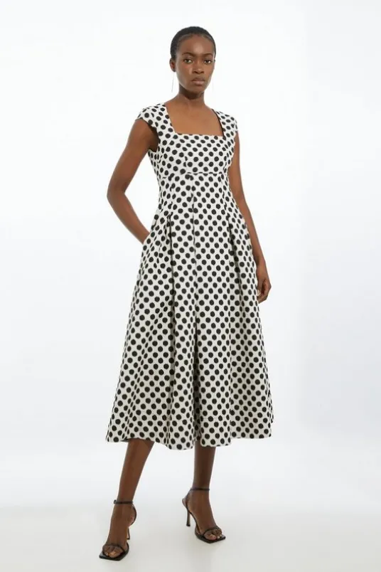Spotty Jacquard Tailored Square Neck Full Skirted Midi Dress