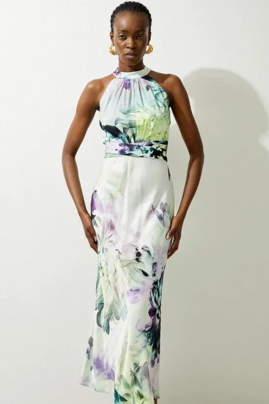 Spring Floral Hammered Satin Woven Halter Midi Dress