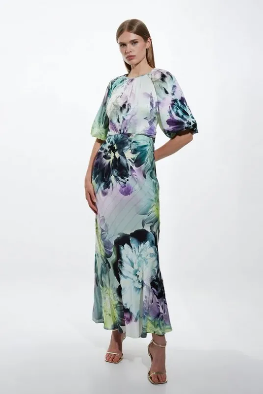 Feel formal in our midi dress, with high quality satin fabric, featuring a fit and flare silhouette, three quarter length sleeves with a voluminous balloon design, and a charming floral print. Style it with court heels or strappy heels for a look that will take you from dinner dates to wedding guest days to dressy evenings out.Spring Floral Printed Hammered Satin Woven Midi DressHigh Quality, Hammered Satin FabricFigure Hugging BodiceFlattering Flared SkirtAbstract Floral PrintShort Balloon SleevesButton and Tie Fastening in BackDetails & Care100% viscose. Gentle machine wash at 30 with similar colours. Model Height 5”10 – Model wears a UK 8/US Size 6. Centre back length of a 10: 120cm