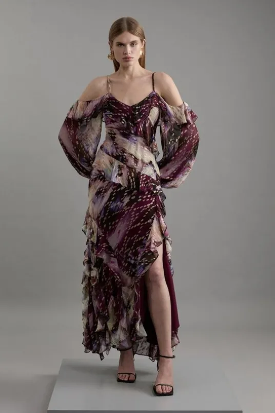 Make a statement with our striking occasion dress, which features an ultra flattering fit and flare silhouette with off shoulder sleeves, as well as shimmering metallic detailing. Style it simply with strappy sandals or heels for a look that will take you from wedding guest days to date nights to holiday evenings.Strappy Metallic Thread Ruffle Maxi DressShimmering Metallic Thread AccentsFlattering Fit and Flare SilhouetteDeep V NecklineStatement Off Shoulder SleevesAdjustable Spaghetti StrapsRuffled, Flowing SkirtStriking Thigh High Leg SplitZip Back FasteningDetails & Care92% Viscose/ 8% Metallic fiber. Lining 100% Polyester. Do not tumble dry. Do not dry clean. Model wear size uk10- Length 135cm