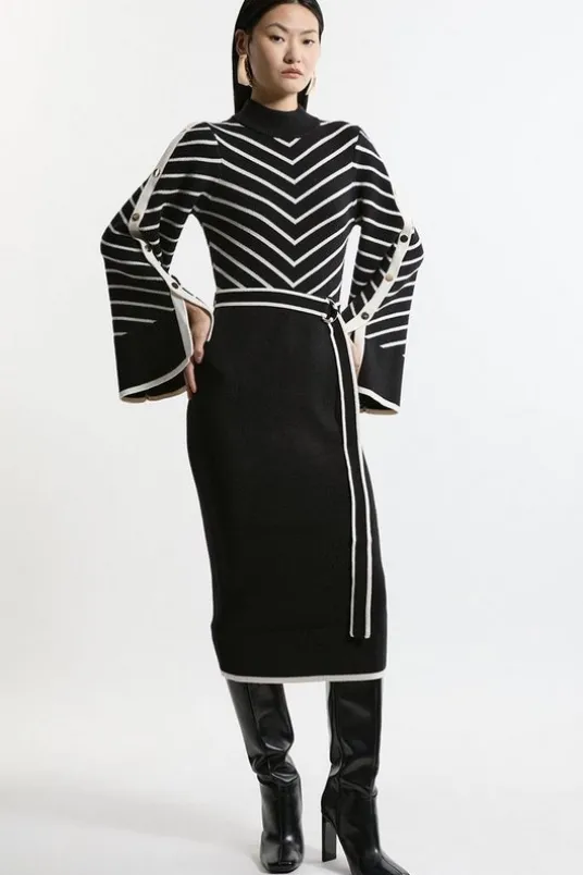 Feel elegant in our midi dress, with a universally flattering, straight silhouette, dramatically flared sleeves, and a belted waist for a cinched silhouette. Style this dress with heeled boots for an outfit that will turn heads from office days days to upcoming occasions and events.Striped Viscose Blend Knit Belted Midi DressHigh Quality Knit FabricStatement Flared SleevesContrasting Monochrome Colourway Flattering Fitted Silhouette Metallic Button Detailing on SleevesBelted WaistbandDetails & Care52% viscose/rayon, 28% polyester, 20% polyamide. 30 degrees wool cycle. model wears a Small. models height is 5″7. centre back length is 124cm.
