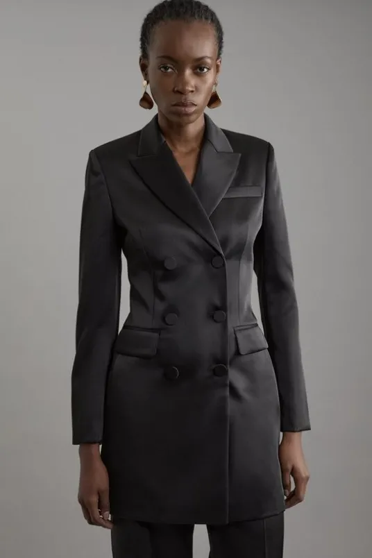 Delivering a combination of dressed-down glamour and statement style, discover COLLECTIONS: 06 Partywear.A new addition to a tailored essentials collection, this double breasted jacket is tailor-made with an easy to style, sleek design, double breasted button accents, and a V neckline. The satin fabric makes for a unique take on a formal outer layer. Style this piece with tailored trousers and heels for a look that goes seamlessly from office days to date nights.Structured Viscose Satin Tailored Double Breast JacketHigh Quality, Sleek Satin FabricUnique, Longline DesignV NecklineFormal Collar FeatureFlattering Figure Hugging SilhouetteClassic Double Breasted DesignButton Front FasteningMatching Trousers Sold SeparatelyDetails & Care87% polyester, 13% viscose. Model wears UK10/US6. Model height 5″9. Length approx: 92cm