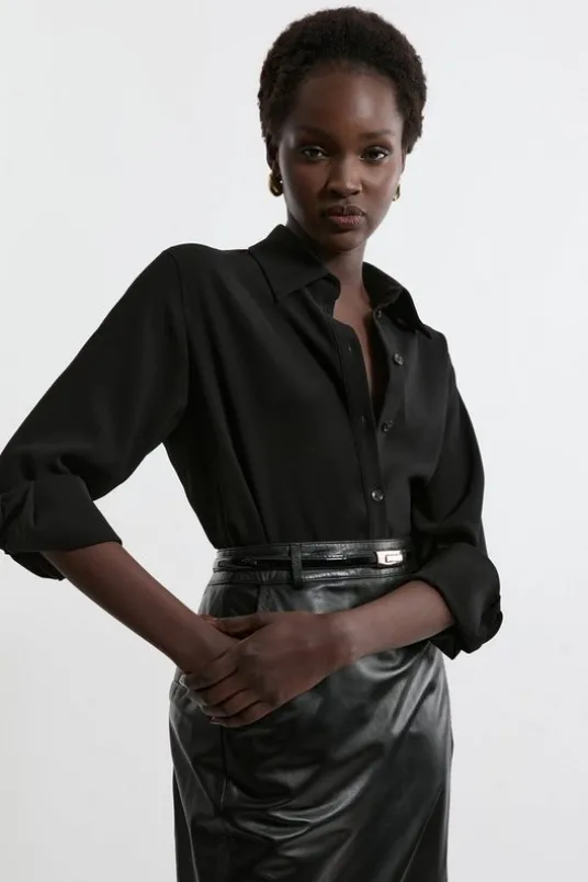 Feel elevated in our classic button up shirt, featuring a relaxed fit, and button detailing down the front. This piece can be easily paired with anything from tailored trousers to denim jeans for looks that go from office days to drinks receptions.Tailored Crepe Essential ShirtHigh Quality Crepe FabricFlattering Relaxed FitClassic, Collared NecklineMetallic Button DetailingButton Front FasteningDetails & Care100% polyester, model wears UK10/US6, model height 5″9, length approx: 65cm