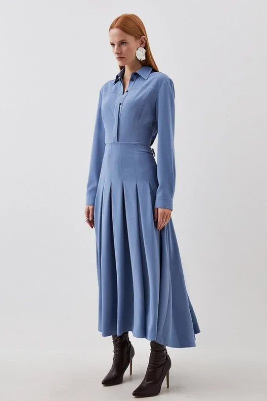 Tailored Crepe Pleated Midi Shirt Dress
