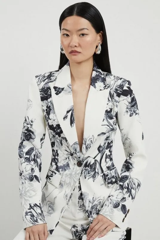 Tailored Crepe Printed Mono Floral Single Breasted Blazer