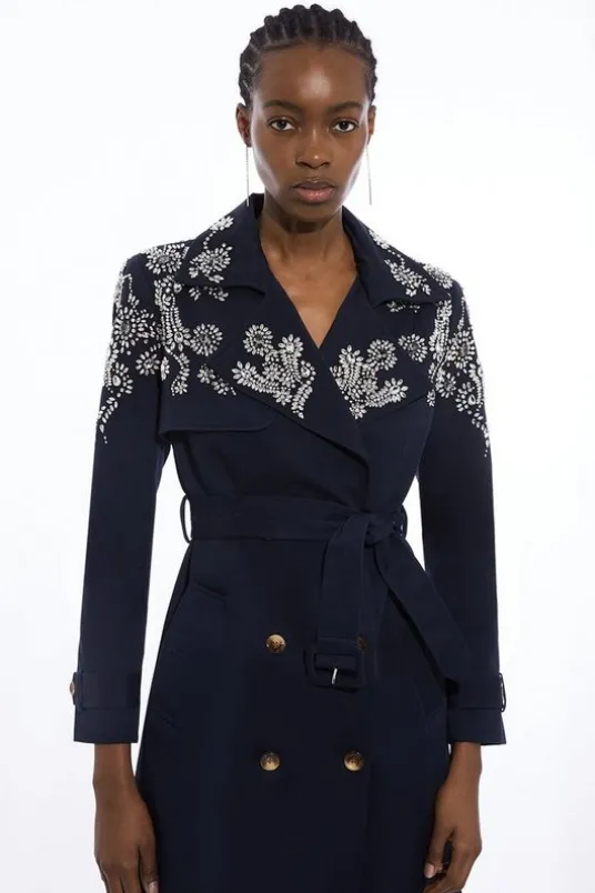 Tailored Crystal Embellished Belted Trench Coat