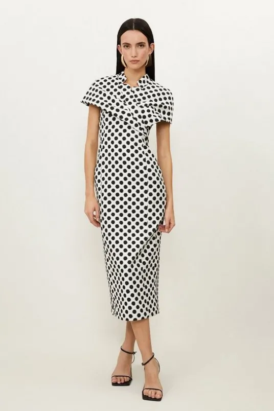 Embrace elegance with this midi dress, tailored with a stand out cape sleeve and notched detailing. Finished with a pencil fit for a flattering silhouette and spot print for a dramatic touch. Pair with silver-tone heels and accessories for spring occasions.Pencil dressCape sleevesMidi lengthDetails & CareMain: 52% Polyester 46% Cotton 2% Elastane/Spandex. Lining: 100% Polyester. Dry clean only. Model wears UK Size 8/ US Size 4. Model height approx: 5″9. Length approx: 125cm