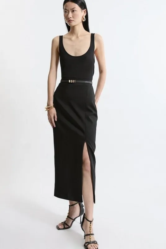 Experience updated wardrobe essentials with our midi skirt, with a straight silhouette and a high waistline, creating a universally flattering fit. The leg split is fully adjustable, with a zip addition that allows you to customise the look. Style this piece with anything, from the matching waistcoat and strappy heels, to a knit jumper, tights, and boots.Tailored Midaxi SkirtSleek, Minimal DesignComfortable High WaistlineFlattering Straight SilhouetteOptional Thigh High Leg SplitZip Split DetailingMidi LengthDetails & CareMain: 74% Viscose/Rayon, 18% Polyester, 4% Cotton, 4% Linen. Lining: 100% Polyester. Dry clean only. Model height 5’9, wears UK 10/US 6. Length 37cm.