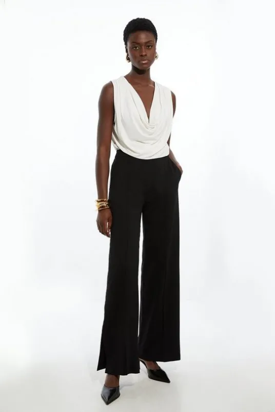 SALECLOTHINGSale New InCYBER DEALSSale PantsSale WorkwearSale Under $172Experience elevated tailoring in a pair of wide leg trousers, made in ponte fabric, featuring a flattering, relaxed fit and a comfortable high waistline. The sleek design makes them easy to style with anything, from a button up shirt for a formal look, or with a T-shirt and trainers for a more laid back approach.Tailored Ponte Wide Leg TrousersHigh Quality Ponte FabicComfortable High WaistlineFlattering Wide Leg Fit Pocket Accents Ankle Split DetailingSleek, Minimal DesignDetails & CareMain 75% Viscose/Rayon, 21% Polyester, 4% Elastane/Spandex. Lining 100% Polyester. Dry clean only. Model Height 5”10 – Model wears a UK 10/ US Size 6. Length 113cm.