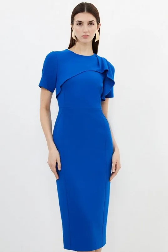 Tailored Structured Crepe Ruffle Detail Pencil Midi Dress