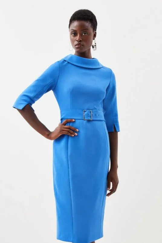 Showcasing ’60s-inspired style, this midi dress exudes a timeless aesthetic. A turtleneck design effortlessly blends into the bodycon style, while a buckle belt subtly cinches the waist. Pair this piece with heels for workwear or after-dark occasions.Tailored DressMidi HemlineWaist BeltRoll NecklineThree-quarter sleevesDetails & CareMain: 38% Polyester 32% Viscose/Rayon 25% Polyester. Lining:100% Polyester. Dry Clean Only. Model wears UK size 8/ US size 4. Model height Approx: 5″9. Length Approx: 113cm
