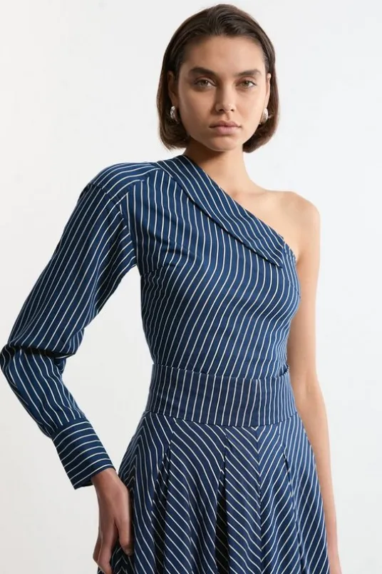 Elevate your wardrobe essentials in our tall shirt, which features an asymmetric design that is certain to turn heads. With a collar style neckline, sitting at a one shoulder angle, and a pinstripe pattern, this piece styles well with jeans or tailored trousers for an outfit that can be worn again and again.Tall Asymmetric Twill Striped Woven Long Sleeved ShirtHigh Quality Twill FabricFlattering Relaxed FitUnique One Shoulder, Asymmetric DesignClassic Pinstripe PrintMatching Skirt Sold SeparatelyExpertly designed for those 5’10” and above, our Tall pieces are perfectly proportioned for a taller frame using longer lengths.Details & Care55 Viscose/ 30% Lyocell/ 15% Polyamide. Wash with similar colours. Wash inside out. Iron on reverse whilst damp. Model wears size UK8.