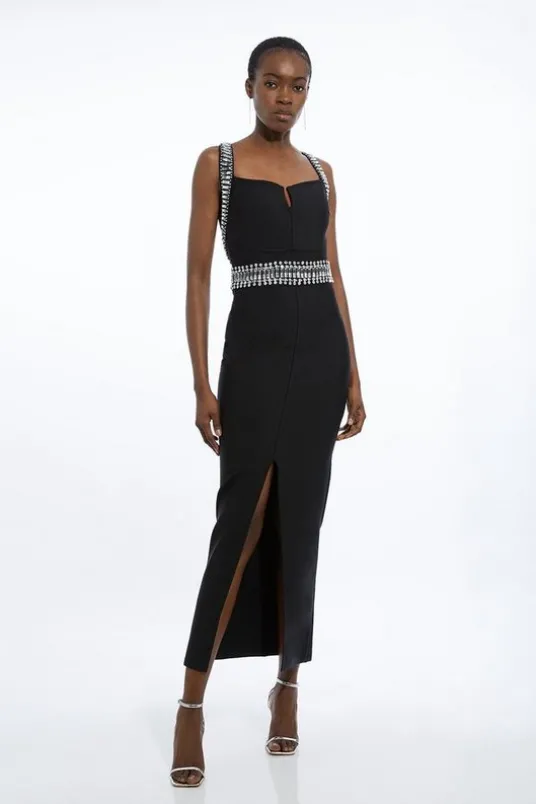 Elevate your occasion wear wardrobe with our tall maxi dress, with a bodycon silhouette, a straight neckline which elevates the formality and accentuates the bust, a dramatic leg split, and sparkling embellishments. Style it with strappy heels for an occasion look that is guaranteed to turn heads wherever you step.Tall Bandage Figure Form Knit Embellished Maxi DressHigh Quality Knit FabricFigure Hugging FitFormal, Straight NecklineKeyhole Accent in BustStatement Sparkling EmbellishmentsThigh High Leg SplitZip Back Fastening Expertly designed for those 5’10” and above, our Tall pieces are perfectly proportioned for a taller frame using longer lengths.Details & Care97% polyester 3% elastane. Gentle machine wash with similar colours. Model Height 5”10 – Model wears a S. Centre back length of a size S: 150cm