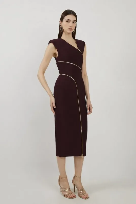 Elevate your occasion wear wardrobe with our tall midi dress, with a bodycon silhouette, and a design that features enticing zip detailing that adornes the entire piece. Style it with strappy heels for an occasion look that is guaranteed to turn heads wherever you step.Tall Bandage Figure Form Sleeveless Zip Midi DressHigh Quality Bandage FabricFigure Hugging FitAsymmetric NecklineUnique, Structured ShouldersStatement Zip EmbellishmentsZip Back FasteningExpertly designed for those 5’10” and above, our Tall pieces are perfectly proportioned for a taller frame using longer lengths.Details & Care97% Polyester. 3% Elastane. Wash on synthetic cycle. Model wears UK Small. centre back length approx 132cm. models height is approx 5″10.