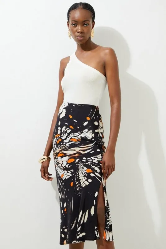 Feel confident in our tall midi skirt, with high quality viscose fabric, featuring a relaxed, figure skimming silhouette, and a statement butterfly print. Style it with a simple vest top or T-shirt and heels for a look that goes seamlessly from day to night.Tall Butterfly Printed Viscose Crepe Woven Midi SkirtHigh Quality Viscose FabricFlattering Straight FitComfortable High WaistlineUnique Butterfly PrintThigh High Leg SplitExpertly designed for those 5’10” and above, our Tall pieces are perfectly proportioned for a taller frame using longer lengths.Details & CareMain: 100%/Viscose/Rayon. Model wears UK Size 10.