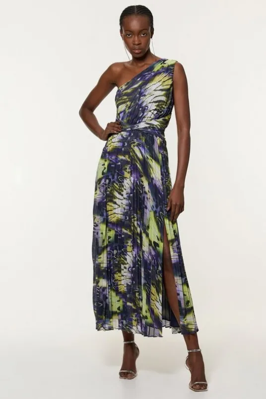 Demand attention in our tall maxi dress, with an entirely pleated design that creates enchanting movement as you walk, strut, or dance, as well as a unique feather print and an ultra flattering fit. Style it with strappy heels for an occasion look that is guaranteed to turn heads from wedding guest days to holiday evenings.Tall Crinkle Feather Print Woven One Shoulder Maxi DressTextured, Pleated DesignStatement Feather PrintOne Shoulder FeatureFlattering Belted WaistThigh High Leg SplitZip Fastening on SideExpertly designed for those 5’10” and above, our Tall pieces are perfectly proportioned for a taller frame using longer lengths.Details & CareMain: 100% Polyester. Lining: 100% Polyester. Wash inside out. Model wears Size UK 10. Length measures 135cm.