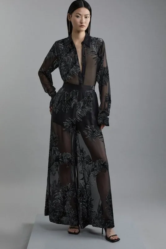 Feel occasion ready in a pair of tall wide leg trousers, with lightweight, sheer fabric, and a relaxed fit ideal for busy evenings. The feather print makes a statement, and they can easily be styled with the matching top for an occasion look with a difference.Tall Feather Devore Woven Wide Leg TrousersStatement Wide Leg FitComfortable High WaistlineUnique Sheer DesignFeather PatterningMatching Top Sold SeparatelyExpertly designed for those 5’10” and above, our Tall pieces are perfectly proportioned for a taller frame using longer lengths.Details & Care51% Viscose/Rayon 49% Polyamide, Lining 100% Polyester. Gentle machine wash at 30 with similar colours. Wash inside out. Model wears a UK 8/US Size 6. Length measures 90cm