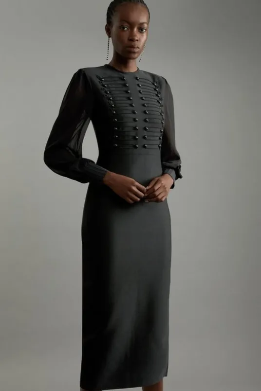 Tall Figure Form Bandage Knit Chiffon Sleeve Military Trim Midaxi Dress