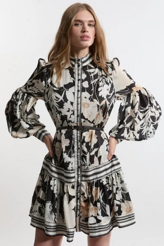 Striking floral print woven mini dressHigh neck design with pleated detailingVoluminous balloon sleeves for dramatic flairBelted waist to accentuate your silhouetteTiered skirt with a playful mini lengthThis Karen Millen Tall Floral Pleated Belted Woven Mini Dress is a statement piece that combines sophistication with a contemporary edge. Perfect for the polished woman who appreciates expert craftsmanship, this dress is versatile enough for various daytime occasions. Style it with sleek ankle boots and a structured tote for a family gathering, or pair it with chic flats and a denim jacket for a casual brunch with friends. The high neck and balloon sleeves add a touch of drama, while the belted waist creates a flattering silhouette. The tiered skirt adds movement and playfulness to your look, making it ideal for those who want to make an impression without compromising on comfort. This dress is a testament to Karen Millen’s commitment to quality and form, ensuring you’ll feel confident and stylish wherever your day takes you.Expertly designed for those 5’10” and above, our Tall pieces are perfectly proportioned for a taller frame using longer lengths.Details & CareMain: 100% Polyester. Lining: 100% Polyester. Model wears UK Size 10. Length measures 90cm.