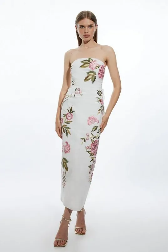 Feel elegant in our midaxi dress, made with breathable linen fabric, featuring a strapless, bandeau neckline, accented with pastel toned floral embroidery. Style this dress with strappy heels for an outfit that will turn heads from holiday evenings to upcoming occasions and events.Tall Linen Embroidery Bandeau Woven DressHigh Quality Linen FabricFeminine, Floral Embroidered DetailsFlattering Fitted SilhouetteStrapless, Bandeau NecklineMidi LengthLeg Split in BackZip Fastening in BackExpertly designed for those 5’10” and above, our Tall pieces are perfectly proportioned for a taller frame using longer lengths.Details & CareShell: 87% Cotton/ 13% Linen. Lining: 100% Cotton. Wash on delicate cycle inside out. Do not dry clean. Model wears a UK 8/US Size 6.