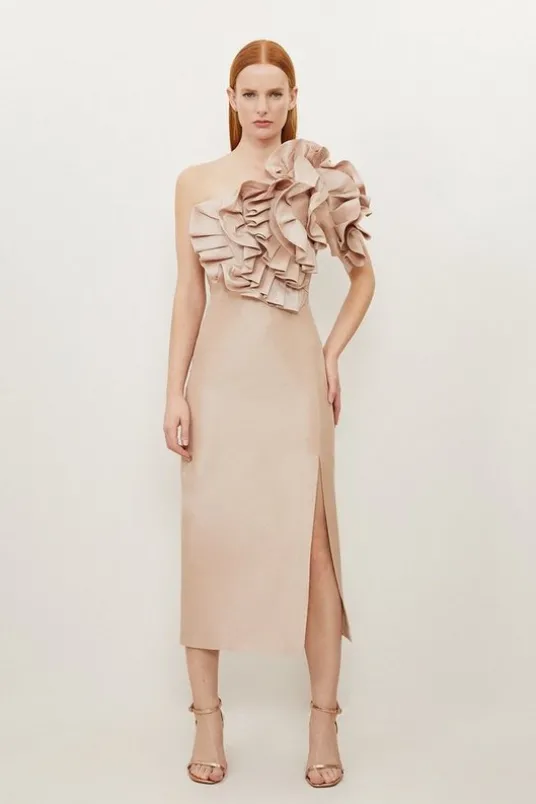 A timeless silhouetted dress is elevated with ataffeta rosette detail for a dramatic touch. Crafted with glossy and soft metallicfabrics, finished with a one shoulder design and front hem split. Pair with barely-there heels for elevated formal wear.Rosette detailOne shoulderMidi lengthExpertly designed for those 5’10” and above, our Tall pieces are perfectly proportioned for a taller frame using longer lengths.Details & CareMain: 65% Nylon, 30% Polyester, 5% Elastane. Lining 100% Polyester. Item length 145cm