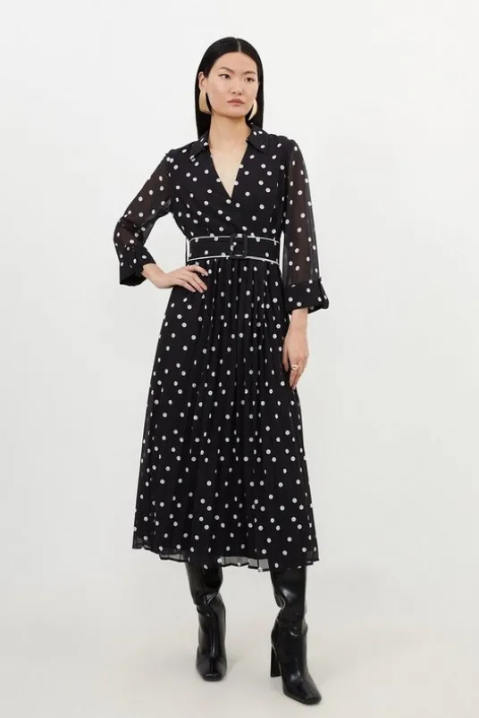 Timeless grace leads with this midi dress, adorned with a polka dot print from a shirt style bodice to a swaying pleated skirt, with a buckle-belt for a fitted waist. Featuring regular long sleeves, and open collar for classic touches, this piece calls for bold accessories and leather boots for elegant work wear.Polka dotGeorgetteLong sleevesExpertly designed for those 5’10” and above, our Tall pieces are perfectly proportioned for a taller frame using longer lengths.Details & CareMain/Contrast: 100% Polyester. Gentle machine wash at 30 with similar colours. Model wears a UK 8/US Size 6. Centre back length of a 8: 140cm
