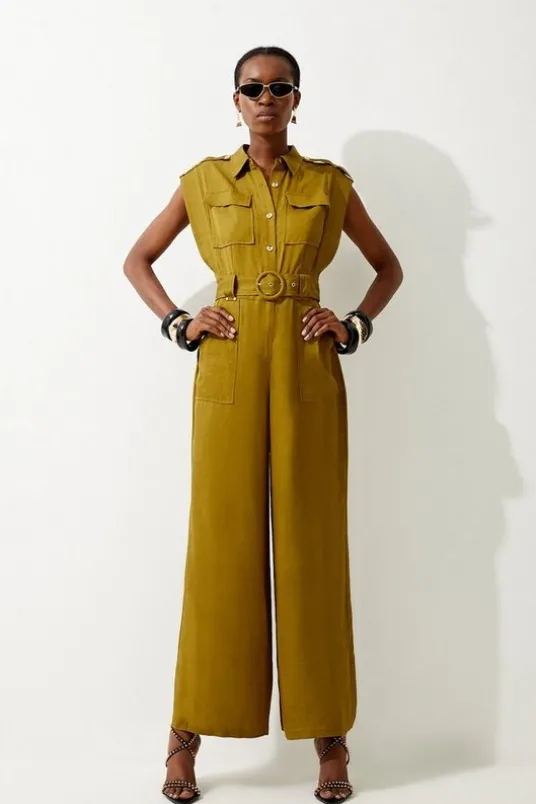 This jumpsuit merges timeless tailoring with an effortless essence. This one-piece is crafted from lightweight linen that beckons to summer styling with premium aplomb. A buckle belt cinches the waist, while a wide-leg design further flatters the form.Point collarButtoned placketChest pocketsWide legSleeveless designExpertly designed for those 5’10” and above, our Tall pieces are perfectly proportioned for a taller frame using longer lengths.Details & Care75% viscose/rayon, 23% lyocell 2% linen. Gentle machine wash at 30 with similar colours. Model Height 5”10 – Model wears a UK 8/US Size 6.