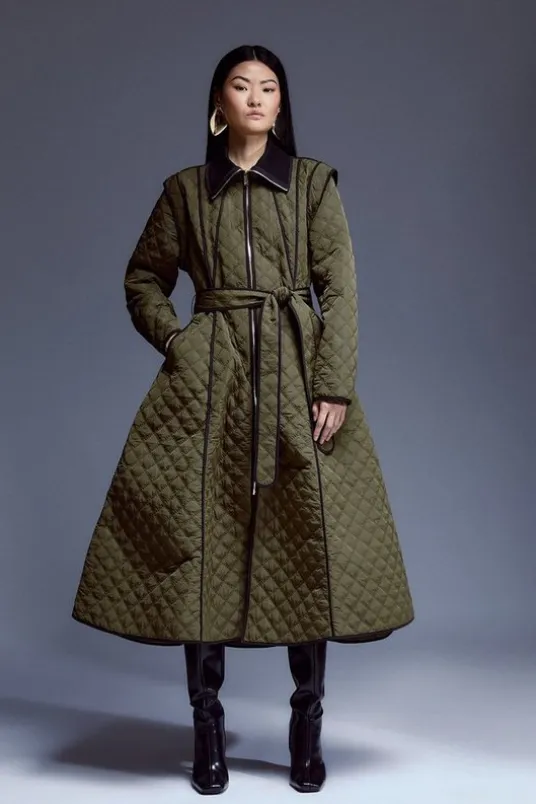 Tall Quilted Full Skirted Belted Midi Coat