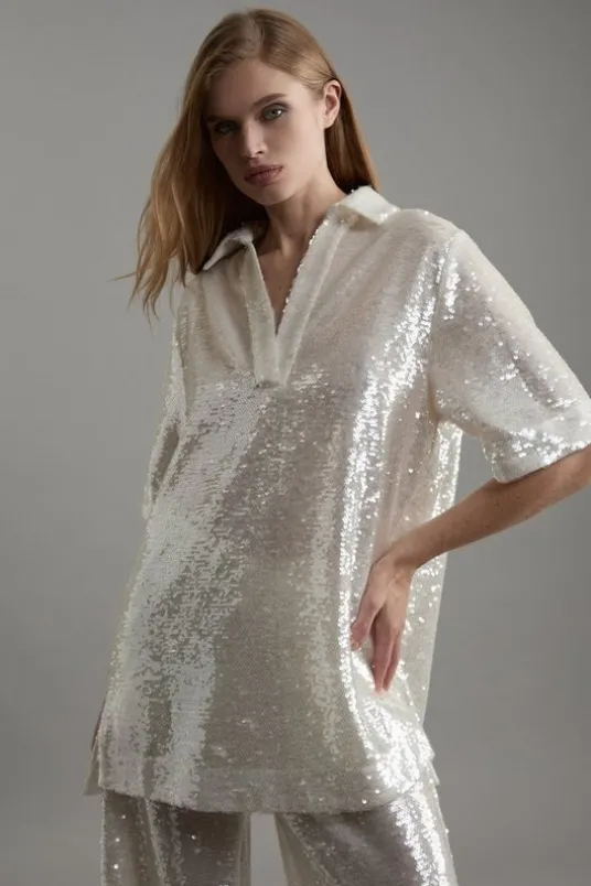 Elevate your every day wardrobe in our tall fit tunic dress, with a relaxed silhouette, as well as a unique sheer, sparkling sequin fabric, and a V neckline with a collar accent. The sheer detailing makes for a dynamic mini dress option. Style it with tailored trousers or go for bare legs, as well strappy heels for an elevated evening look.Tall Sequin Collared Tunic DressHigh Quality, Sparkling Sequin FabricFlattering Relaxed SilhouetteLongline Shirt DesignV NecklineClassic Collar AccentMini LengthExpertly designed for those 5’10” and above, our Tall pieces are perfectly proportioned for a taller frame using longer lengths.Details & CareMain: 100% Polyester. Lining: 100% Polyester. Sequin: 100% Polyethylene terephthalate. Wash inside out. Model wears UK Size 10.