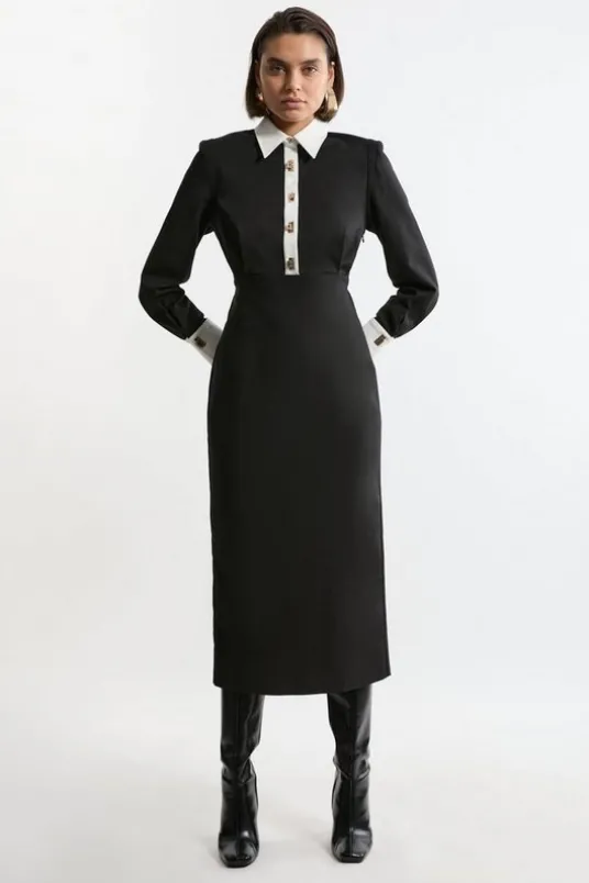Feel formal in our midi dress, with high quality cotton fabric, as well as a straight fit and long, cuffed, and metallic clasp detailing down the front. Style it with court heels or ankle boots for a look that will take you from office days to dinner dates.Techno Cotton Gold Clasp Woven Midi Shirt DressHigh Quality, Soft Cotton FabricFigure Hugging BodiceFlattering Straight Fit SkirtFormal, Collared NecklineGold Clasp DetailingDetails & Care50% Cotton/ 47% Polyamide/ 3% Elastane. Wash with similar colours. Wash inside out. Iron on reverse. Model wears size UK8. Length- 135cm