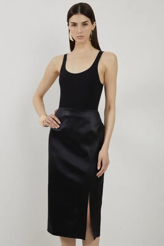 CLOTHINGSALE35% off*extra 20% off | use code: WINTER20CYBER DEALSExperience updated wardrobe essentials with our midi skirt, with a sleek, classic design featuring smooth satin fabric, as well as a straight silhouette and a high waistline, creating a universally flattering fit. Style this piece with anything, from a blouse and strappy heels, to a knit jumper, tights, and boots.Textured Italian Satin Tailored Midi SkirtHigh Quality, Smooth Satin FabricComfortable High Waistline Flattering Straight Silhouette Thigh High Leg SplitZip Fastening in BackMidi LengthDetails & CareMain: 75% Acetate 22% Polyamide 2% Elastane/Spandex. Lining: 100% Polyester. Dry clean only. Model wears UK Size 8/ US Size 4. Model height approx: 5″9. Length approx: 80cm