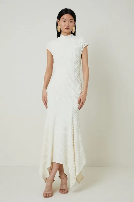 Adorned with texture among soft jersey, this dress elegantly fits the silhouette with a high neck, cap sleeves and dramatic hem cut with a maxi length. Pair with golden accessories and barely-there heels for a timeless occasion look.Cap sleevesTexturedDramatic hemDetails & CareMain: 95% Polyester 5% Elastane/Polyester. Lining: 95% Polyester 5% Elastane/Polyester. Gentle machine wash at 30 with similar colours. Model wears a UK S. Centre back length of a S: 132cm