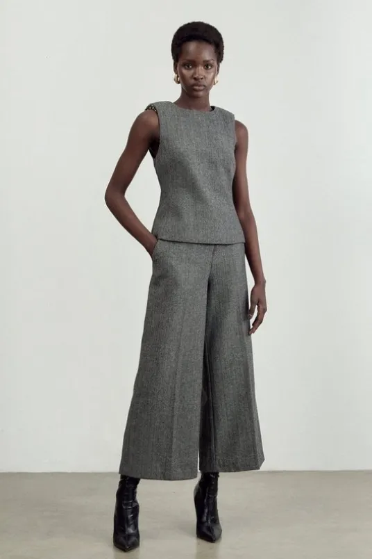 Presenting The Founder: Elevated collection, in collaboration with Karen Millen OBE. Enjoy Karen Millen legacy designs, with timeless silhouettes and classic details that are forever on-trend and ready to wear. Experience elevated tailoring in a pair of straight leg trousers, featuring a flattering, relaxed fit, a subtle herringbone pattern, and a comfortable high waistline. The sleek design makes them easy to style with anything, from the matching top for a formal look, or with a T-shirt and trainers for a more laid back approach.The Founder Herringbone Straight Leg Cropped TrousersComfortable High WaistlineFlattering Straight Leg FitSubtle Herringbone PatternPocket AccentsMatching Top Sold SeparatelyDetails & Care51% wool, 46% polyester, 2% acrylic, 1% polyamide. Model wears UK10/US6. Model height 5″99. Length approx 74cm.