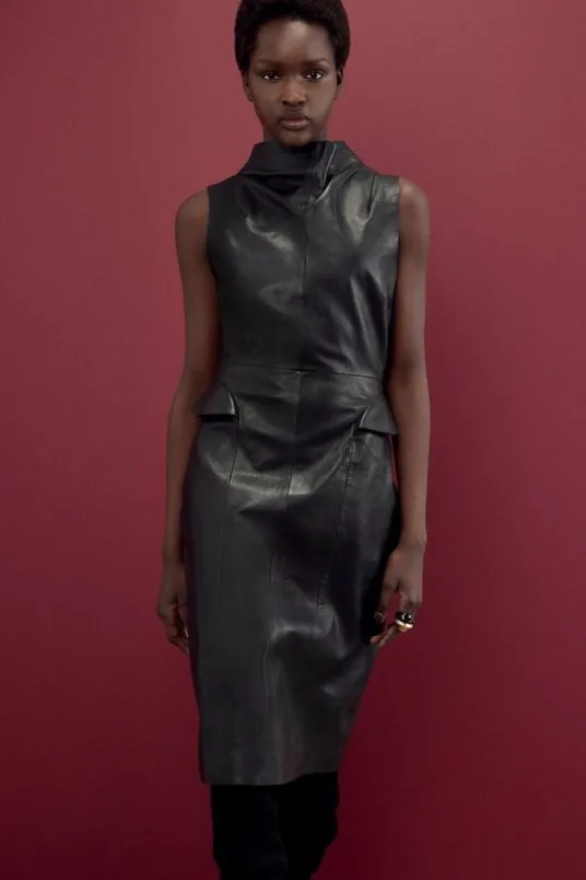 Presenting The Founder: Elevated collection, in collaboration with Karen Millen OBE. Enjoy Karen Millen legacy designs, with timeless silhouettes and classic details that are forever on-trend and ready to wear. Elevate your evening wardrobe with our midi dress, with a fit that skims the curves, a high neckline, and sculptural hip detailing. The supple, real leather fabric elevates this piece, making it perfect for multiple occasions. Style it with statement strappy heels for an occasion look that is guaranteed to turn heads wherever you step.The Founder Leather Cowl Neck Hip Detail Midi DressHigh Quality Real LeatherStatement High Cowl NecklineCasual Sleeveless DesignFigure Hugging SilhouettePeplum Style Hip DetailingZip Fastening in BackDetails & Care100% Leather. Dry clean only. Model wears size 10/us 6. Item length approx 83cm