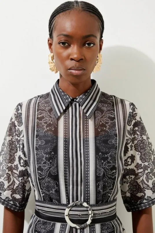 Experience elevated summer looks in our mini dress, made with organdie fabric, with a universally flattering silhouette, and a belted waist for a cinched silhouette. Style this dress with anything, from heeled boots or block heels for an office look, then with sandals for a summer daytime outfit.Tile Print Organdie Belted Mini DressHigh Quality Organdie FabricFun Tile PrintFlattering Relaxed SilhouetteBelted WaistbandMini LengthButton Front FasteningDetails & CareMain: 100% Recycled Polyester. Lining: 100% Polyester. Wash with similar colours. Model wears size UK 10.