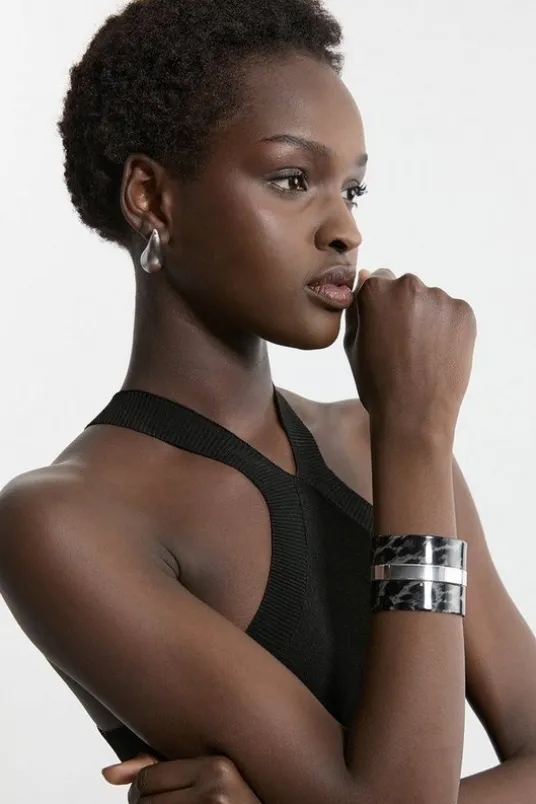 Add enticing detail to an evening outfit with a cuff bracelet. With a chunky design, and metallic colouring that catches the light, this bracelet adds another layer of detail to your outfit. Wear it anywhere, from office days to date nights.Tortoise Cuff BraceletChunky DesignUnique Tortoise Shell PatternMetallic Stripe DetailEasy, Slip on DesignDetails & CareCare: Wipe with soft dry cloth. Products must be removed before showering, bathing, grooming and must not come in contact with any chemicals or abrasives. Jewellery comes in a Karen Millen dust bag. materials: acrylic