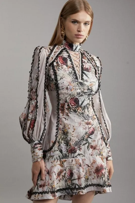 Make a statement with our mini dress, made in lightweight fabric, featuring an ultra flattering, body contouring design, feminine floral details, and lace accents. Style it with sandals or strappy heels for an occasion look ideal for holiday evenings and party nights.Trailing Floral Woven Mini DressContrasting Lace Trim DetailsUnique, Stitched Bust AccentBody Contouring PanelingPlunging V Neckline and V Back DesignStatement Long Balloon SleevesMini LengthButton and Zip Fastening in BackDetails & CareMain: 100% Polyester. Lining: 100% Polyester. Professional dry clean only. Model wears a UK 10. Centre back length: approx 90cm