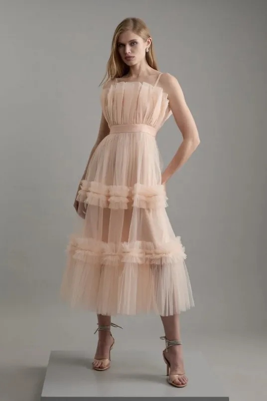 Prepare to turn heads in our tulle dress, designed to make a statement. It features a universally flattering flared silhouette and a strappy bandeau neckline. Style it with strappy heels for an occasion look that is as feminine and charming as it is striking.Tulle Bandeau Tiered Midi DressPremium Tulle FabricStriking Fit and Flare SilhouetteLightweight Sheer Fabric Statement, Voluminous SkirtAdjustable Spaghetti StrapsDetails & CareMain 100% Polyester/ Lining 100% Polyester. Machine wash with similar colours. Model wears UK 8/US 4. Model Height 5″10. Centre Back Length: 125cm.