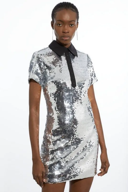 Turn heads in our mini dress, made with sparkling sequin fabric, featuring a high, collared neckline and a fit that flaunts the curves. Styles well with strappy heels or pointed toe shoes for a statement occasion look, perfect for parties and evening plans.Tux Sequin Short Sleeve Woven Mini DressHigh Quality, Sparkling Sequin FabricUnique, Formal Collar AccentCasual T-shirt Style DesignFlattering, Figure Hugging FitZip Fastening in BackDetails & CareMesh 95% Polyester, 5% Elastane/Spandex. Lining 100% Polyester. Main & contrast 60% Cotton, 37% Polyamide, 3% Elastane/Spandex. Sequin 100% Polyethylene terephthalate. Wash inside out. Wash with similar colours. Iron on reverse. Do not bleach. Do not tumble dry. Place in delicate bag prior to cleaning. Model height approx: 5″9. Model wears UK Size 10/ US Size 6. Length 88cm