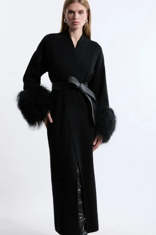 The perfect choice for transitioning seasons, this soft knit coatigan features a soft, thick knitted fabric, and is designed with an ultra comfortable, relaxed fit, and a belted waistline to cinch the silhouette. Style it with anything, from jeans to tailored separates for looks that will take you from office days to coffee catch ups.Viscose Blend Compact Knit Shealing Cuff Belted CoatiganHigh Quality Soft Knit FabricRelaxed, Open DesignComfortable, Relaxed Fit Belted Waistline Statement Shearling TrimsLong, Midaxi LengthDetails & Care52% viscose/rayon, 28% polyester, 20% polyamide with 100% wool trim. 30 degrees wool cycle. model wears a Small. centre back length is 140cm.